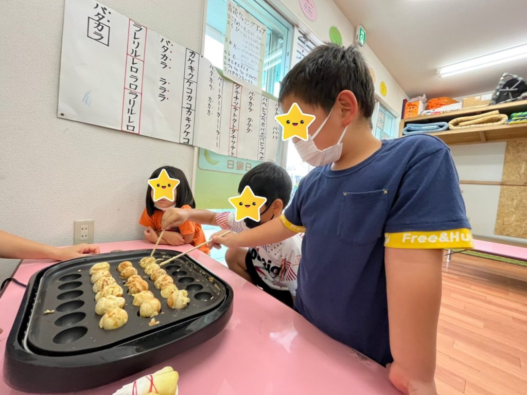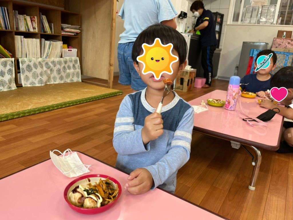 自分たちで作ったたこ焼きと焼きそばは