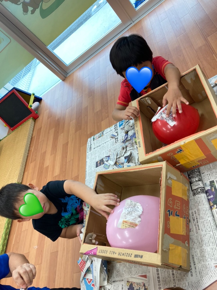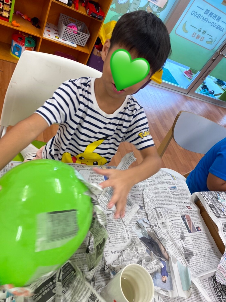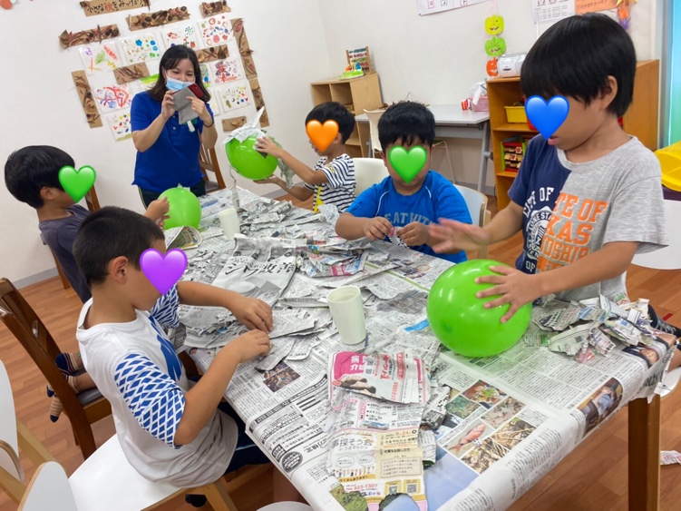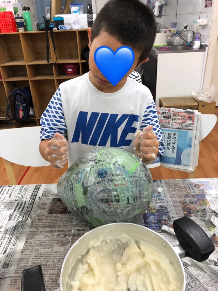 風船に小麦粉ノリで新聞紙を張り付けて