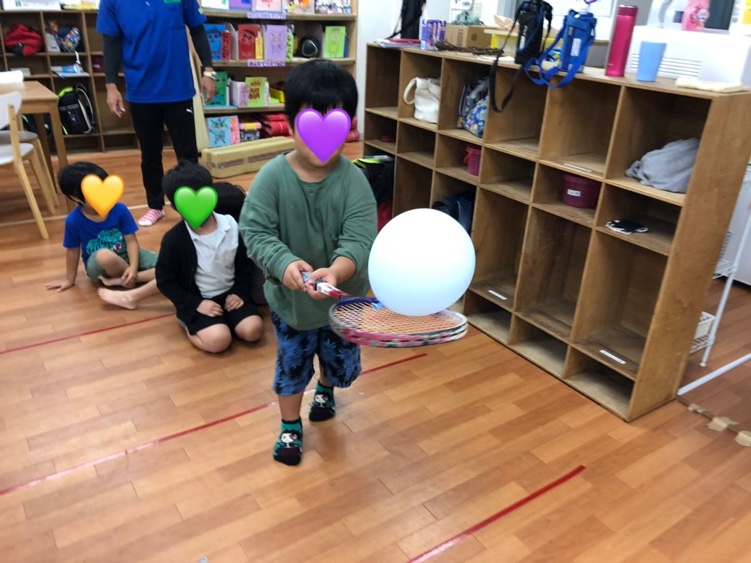 ラケットにボールを乗せて運ぶゲームをしました♬