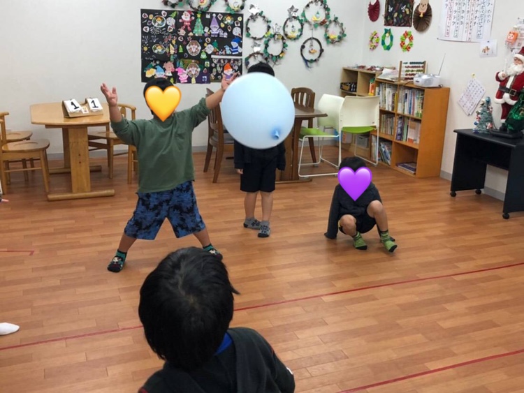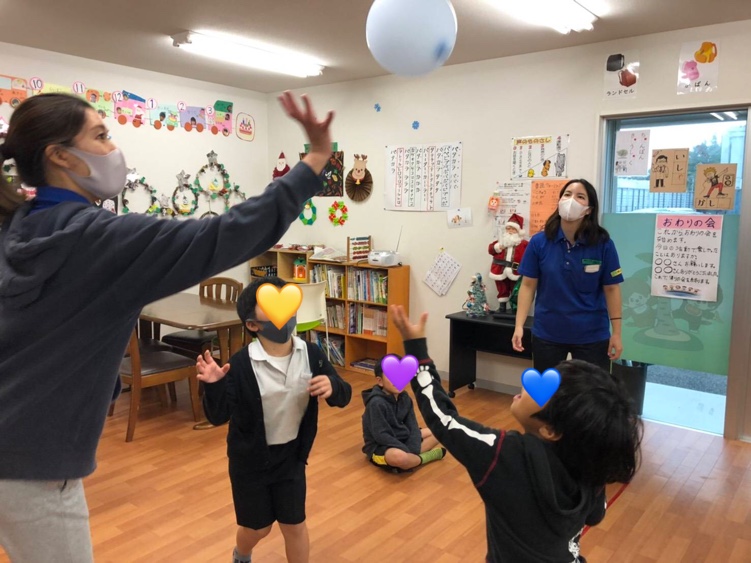 みんなで輪になり風船バレーと
