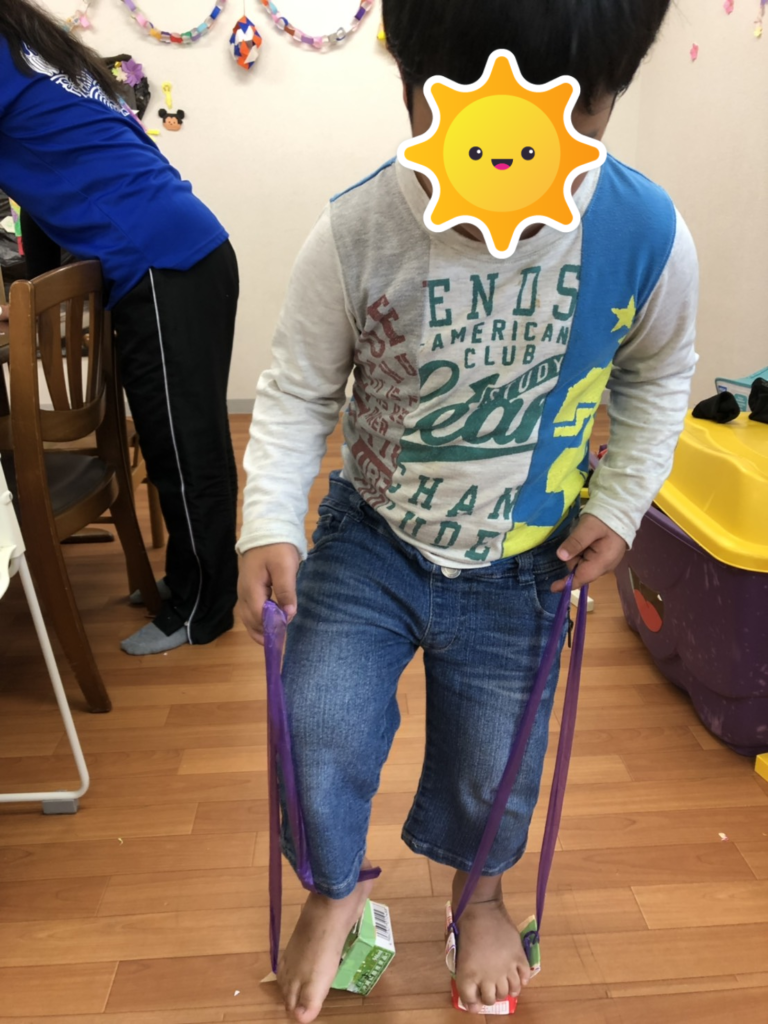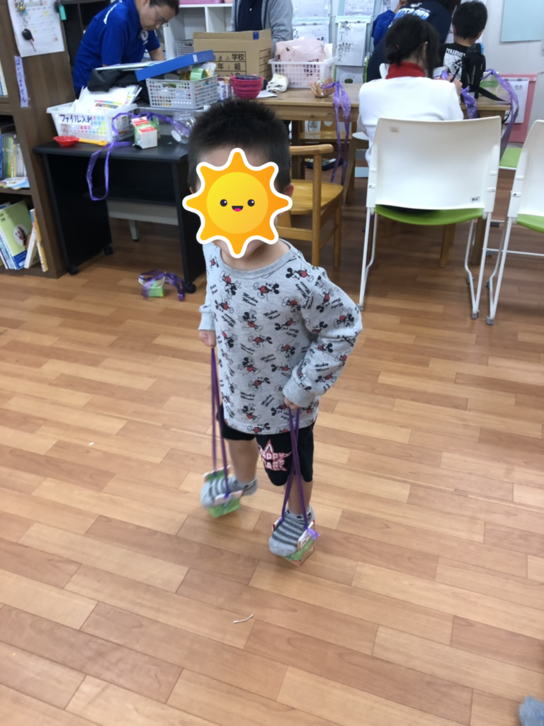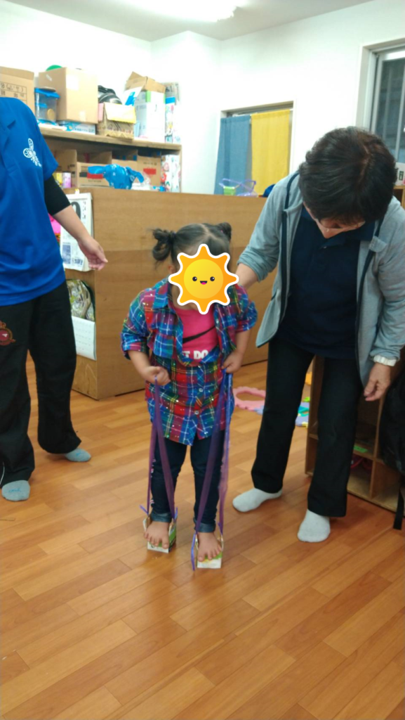ポックリ下駄の完成!最初は先生に支えられながら乗っていた子供たちも、数回チャレンジしただけで一人で乗れるようになっていました。