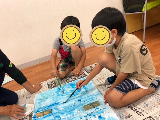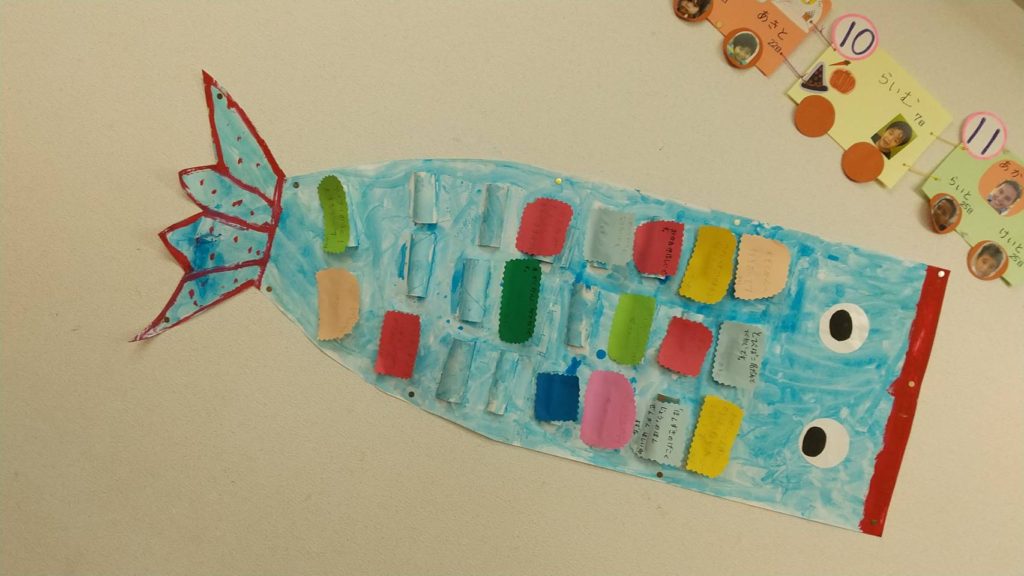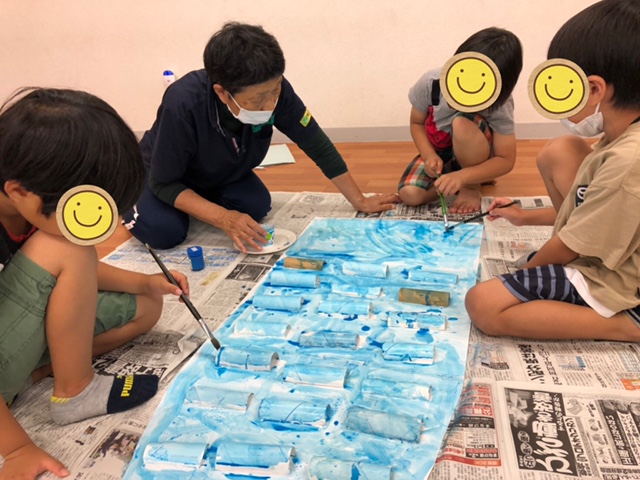 鯉のぼりの壁画をみんな一丸となって創作しています‼