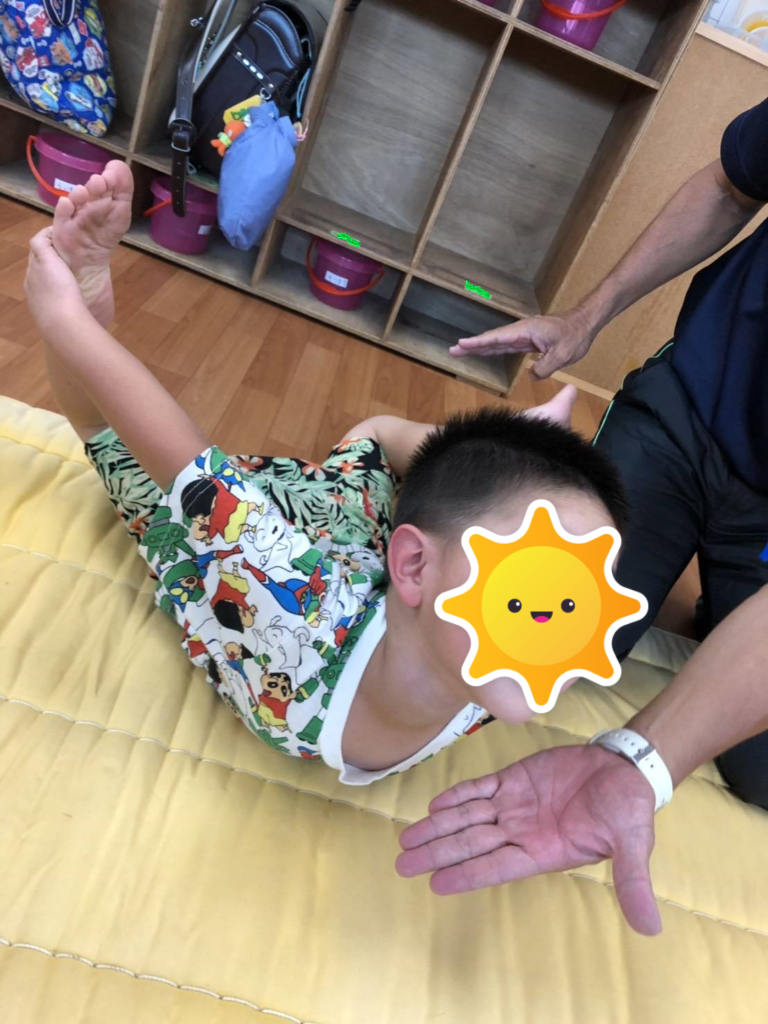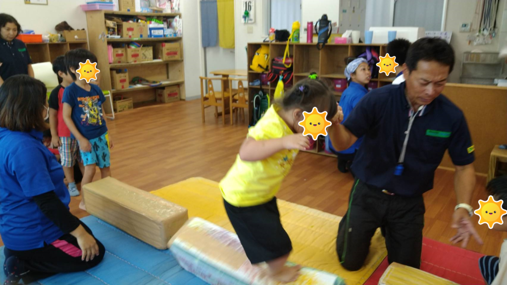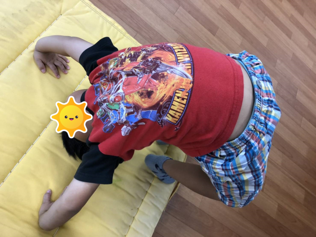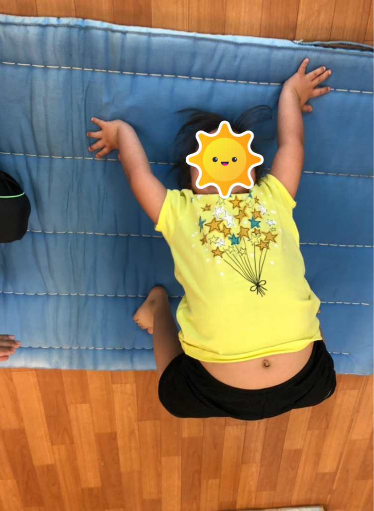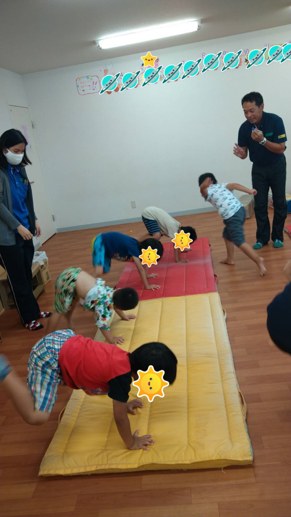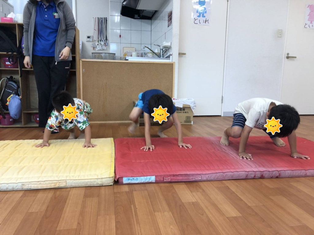 身体活動「マット運動」の様子です。おへそが出るくらい見事なアーチです。両足を両手でつかむ亀さんポーズも体の柔らかい子ども達は平気です👍