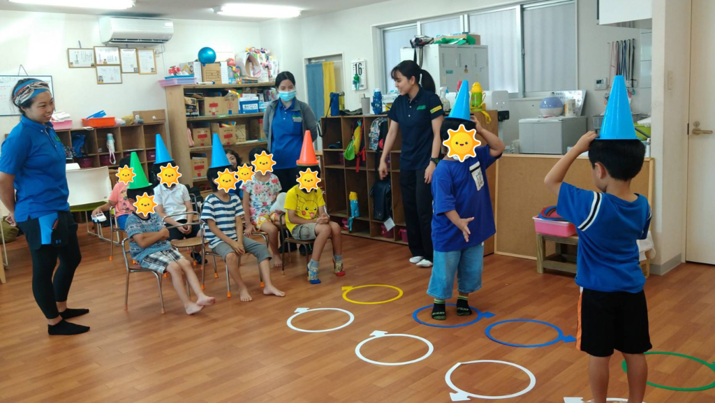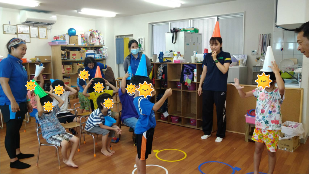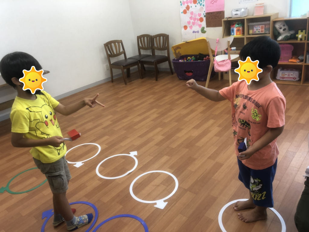 カラーコーンを頭の上に乗せて上手にバランスをとりながらジャンケンしました✊🏻✌🏻🖐🏻子どもたちはお友達を応援しながら楽しそうに活動に取り組んでいましたよ!