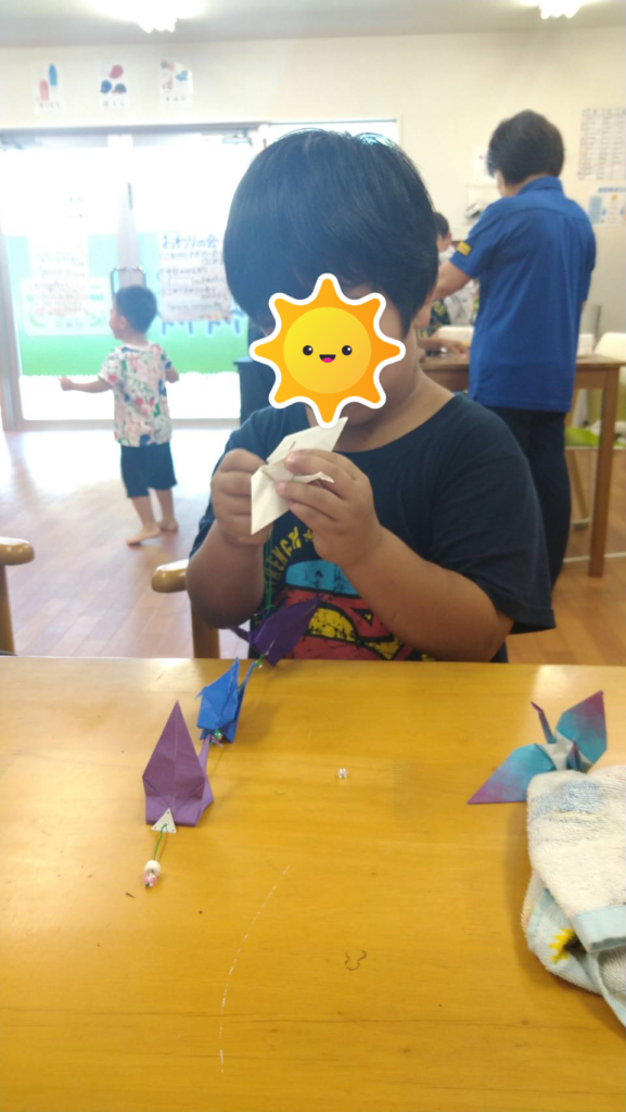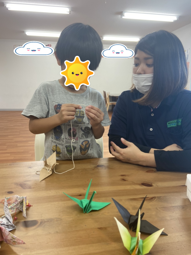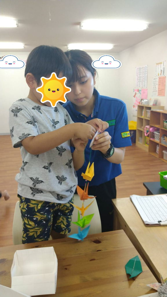 今日の活動は、世界中の平和を願い折りづるのオーナメントを作りました!つるを折るときは丁寧に、ビーズを通すときは慎重にしていました✨子どもたちの願いが叶いますように🍀