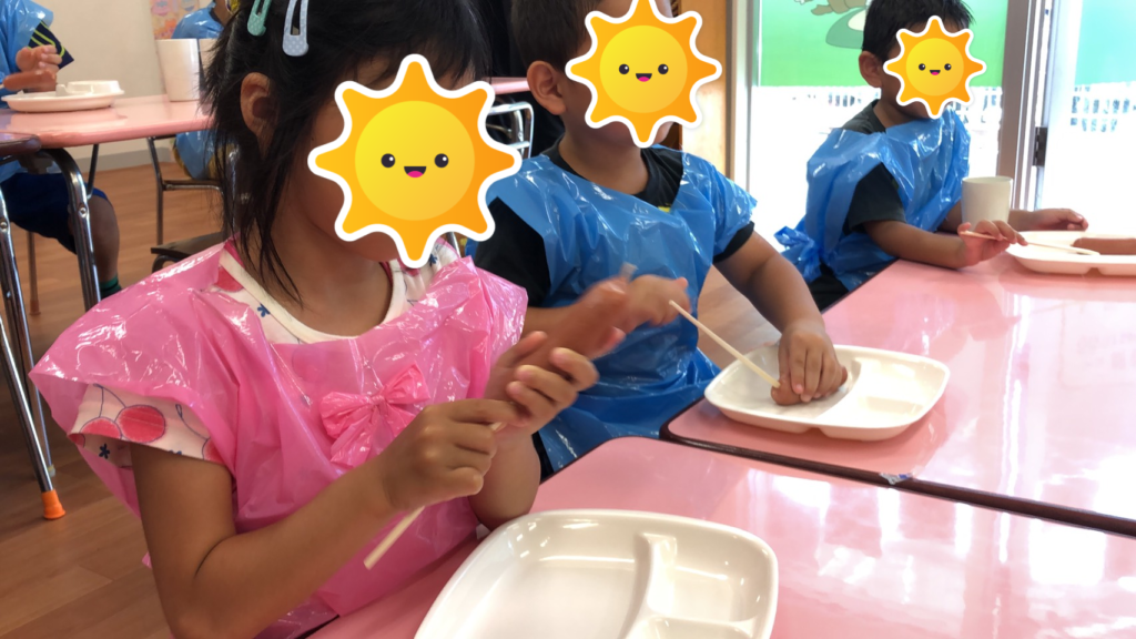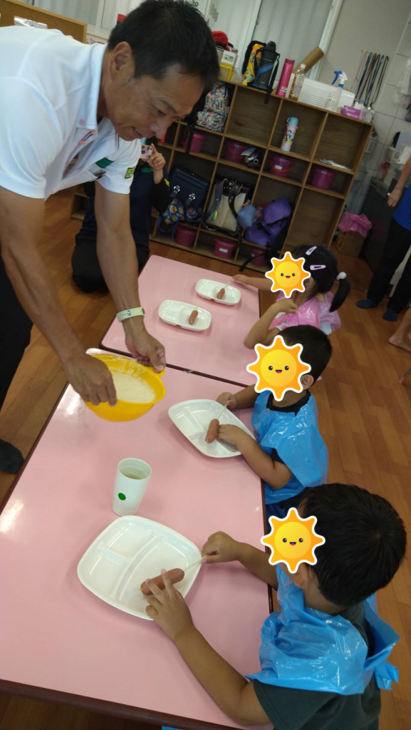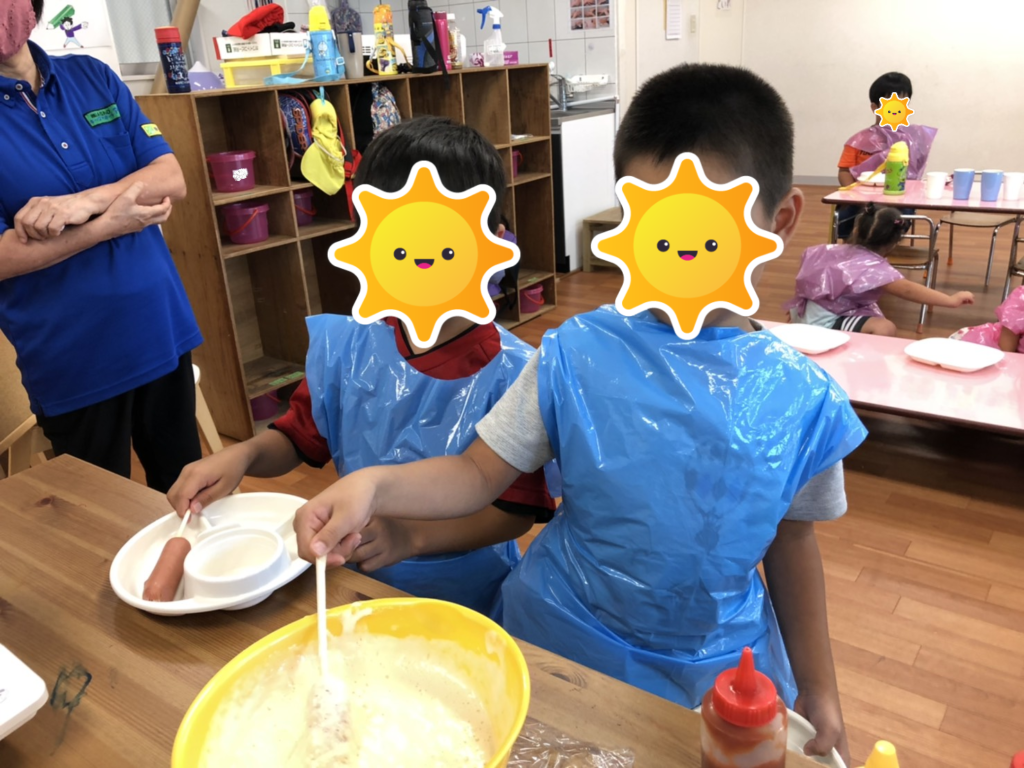前回の粉を混ぜる役割から、グレードアップした子供たち✨今回は、お箸と菜箸の違いを学び、ウィンナーに串を刺し生地をくぐらせるという表現も習いました!誰に教わることなく自ら、全員分の飲み物を準備する優しい心も育っています😊