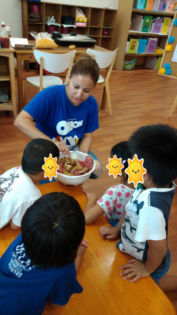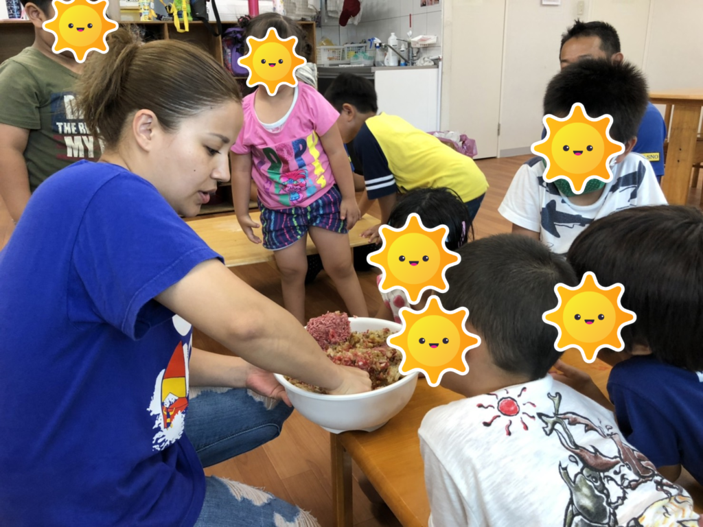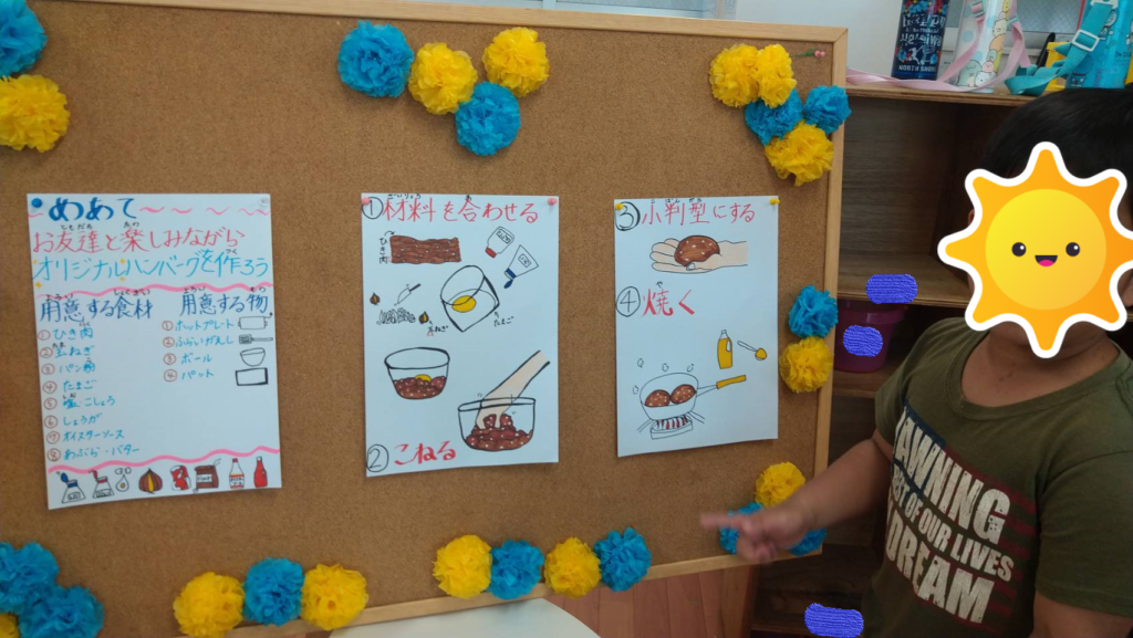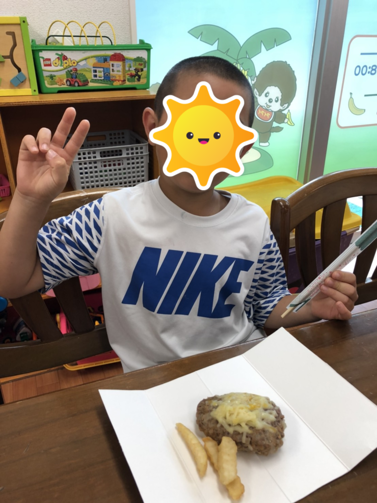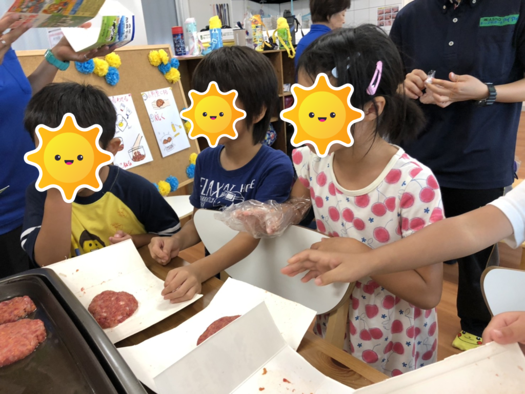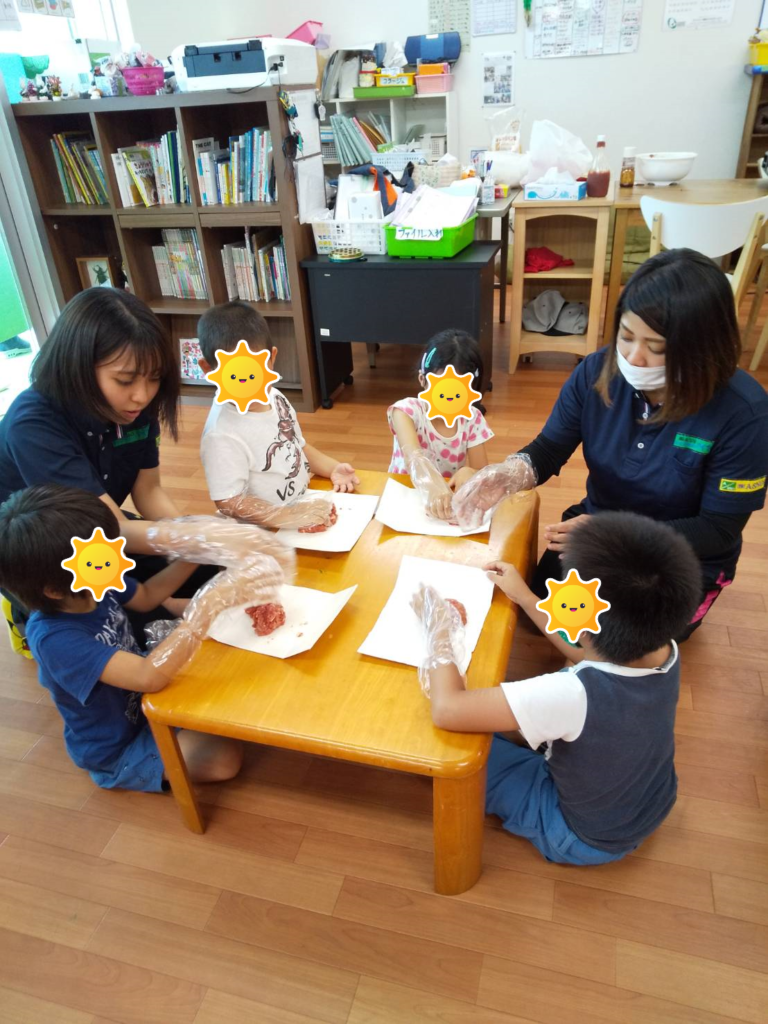 今日のクッキングは、子供たちからのリクエストでチーズハンバーグです!材料、道具の名称とのマッチングを行い、混ぜるとこねるの違いを学びました✨真剣に聞いている姿に指導員も感動です😍(肉パワー凄し!)